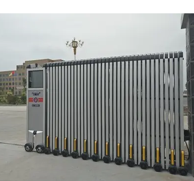 1、无轨电动伸缩门驱动装置,包含装置在伸缩门机头内的两个单独的分别用于驱动伸缩门行走的与伸缩门机头后轮轴连接的后轮驱动和用于控制伸缩门行走方向的与伸缩门机头的前轮轴连接的前轮转向,其中后轮驱动和前轮转向分别与伸缩门的识别并处理伸缩门行走偏离规定线路的信号控 制装置连接并受控于该信号控 制。